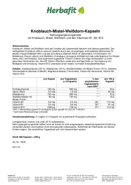 Jede Kapsel enthält 100 mg Knoblauch, 100 mg Mistelpulver und 80 mg Weißdornblätter mit Blüten-Pulver.