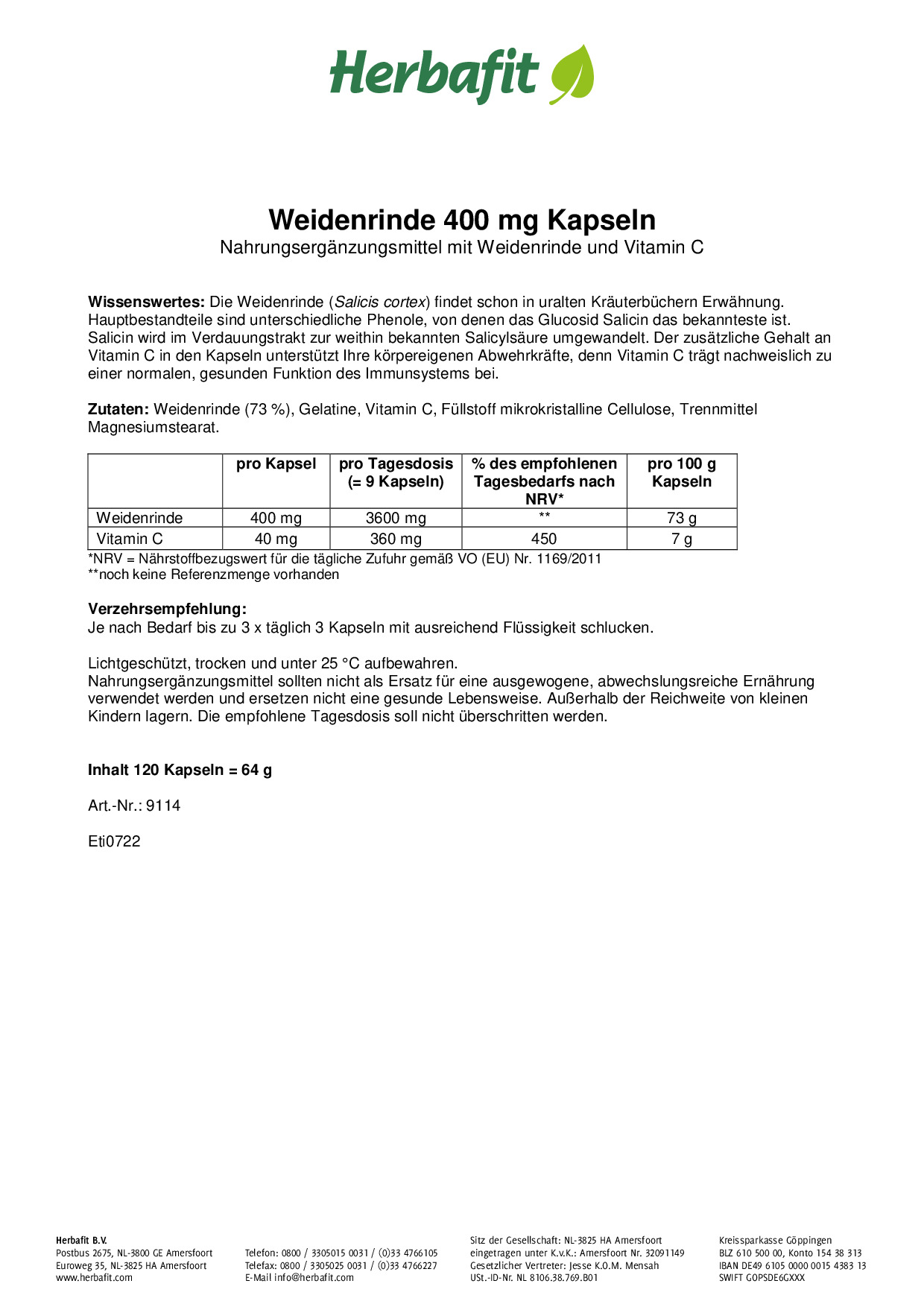 Jede Kapsel enthält: 400 mg Weidenrinde und 40 mg Vitamin C.