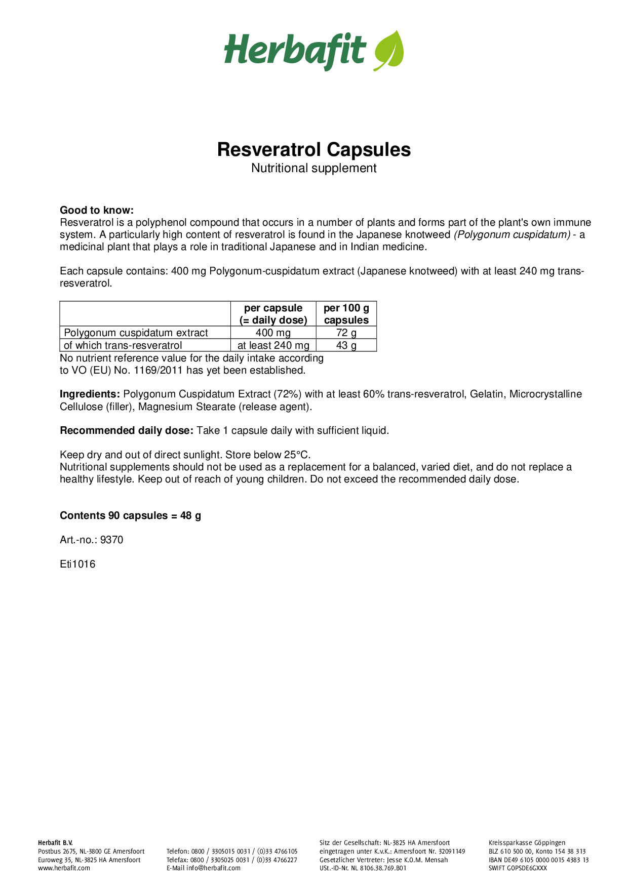 Ingredients: Trans-Resveratrol (41 %), Microcrystalline Cellulose (bulking agent), Gelatine, Magnesium Stearate, Silicon Dioxide (separating agent).
