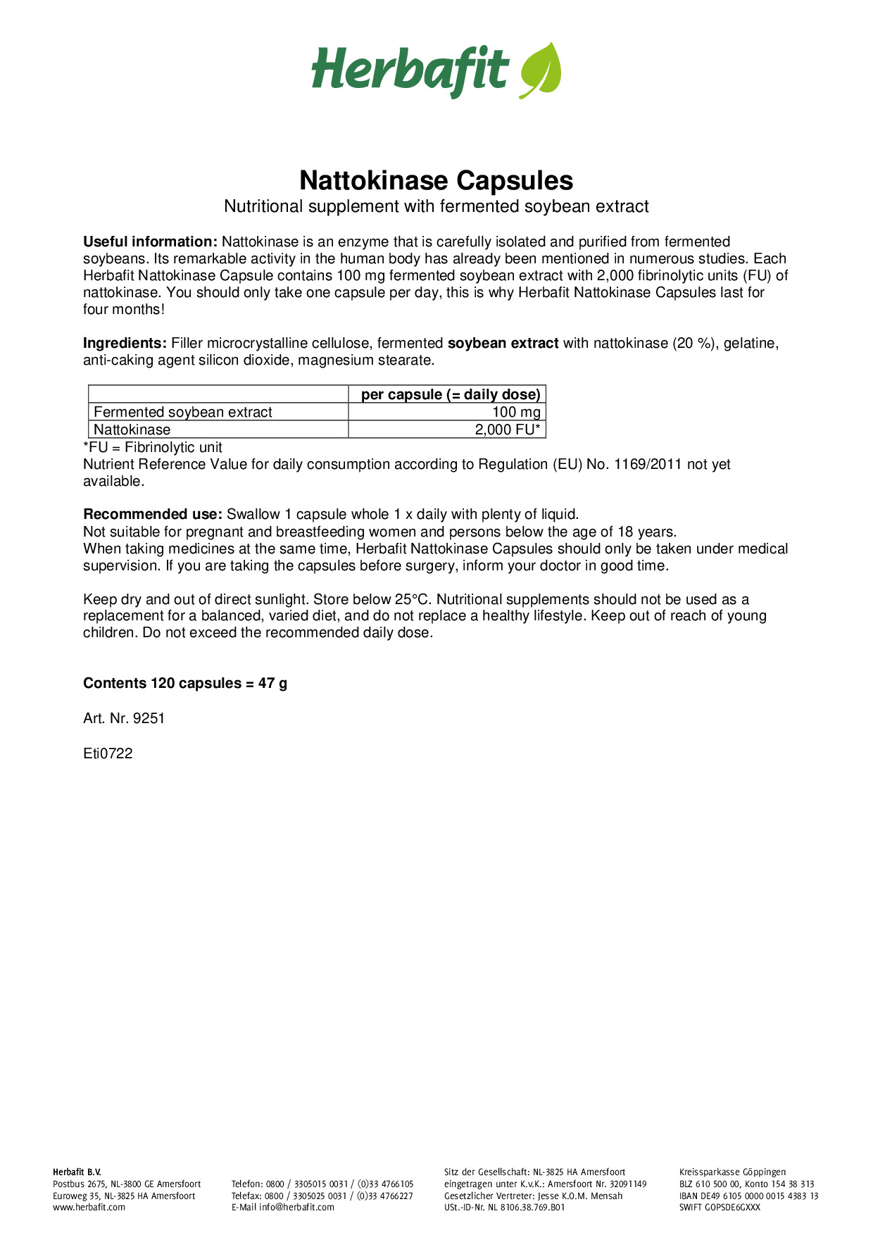 Nutritional supplement with fermented soybean extract. Each Hearbafit Nattokinase Capsule contains 100 mg fermented soybean extract with 2,000 fibrinolytic units (FU) of nattokinase.
