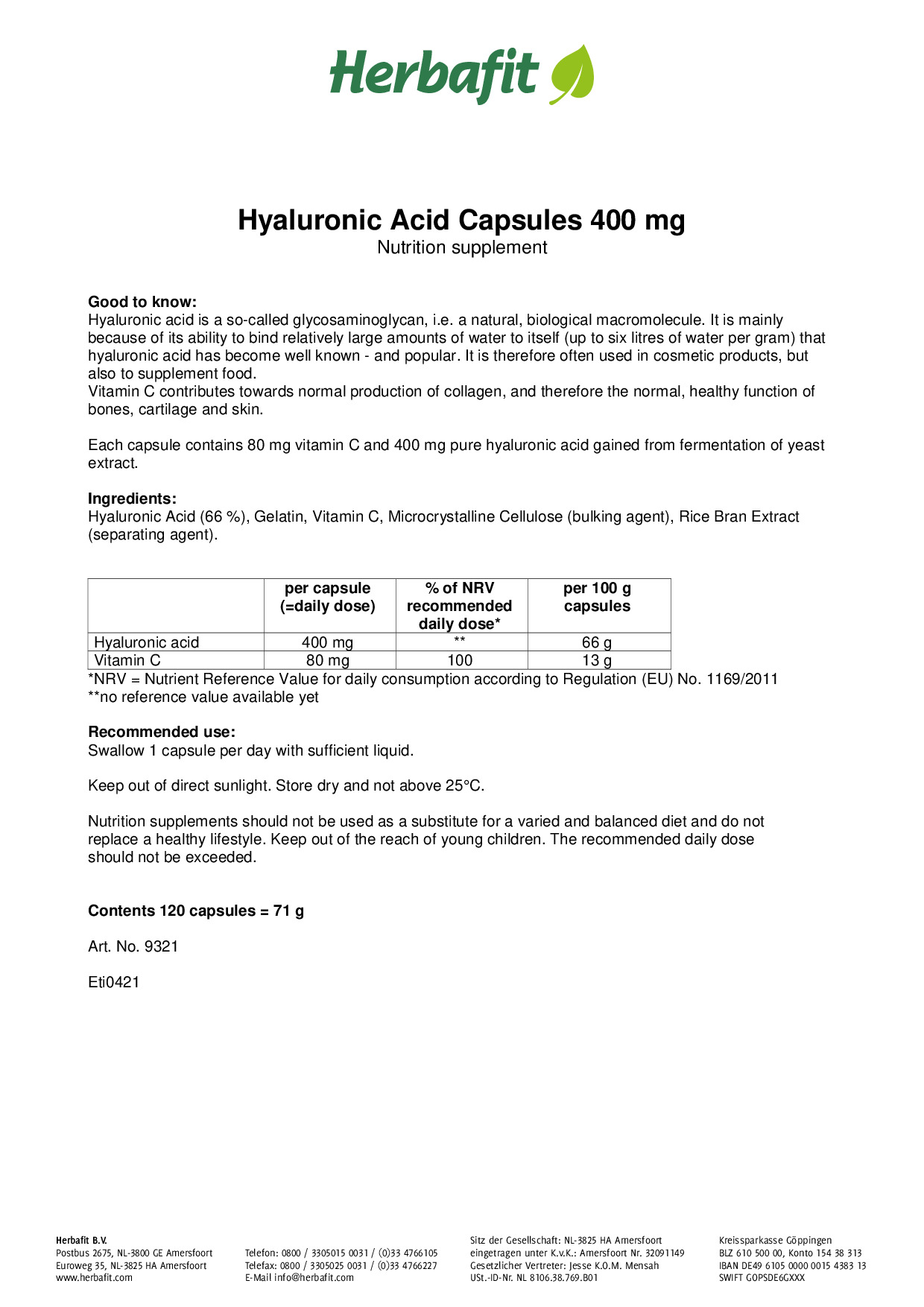 Each Hyaluronic Acid Capsule contains 80 mg vitamin C and 400 mg pure hyaluronic acid.