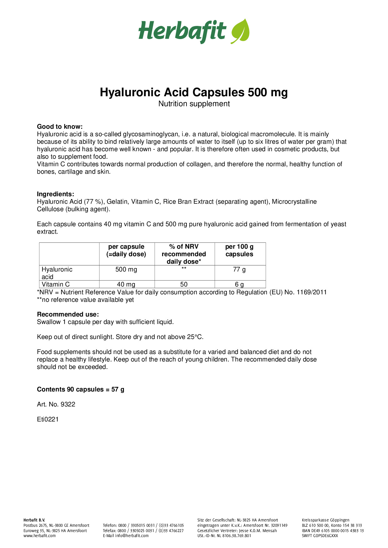 Each capsule contains 40 mg vitamin C and 500 mg pure hyaluronic acid.