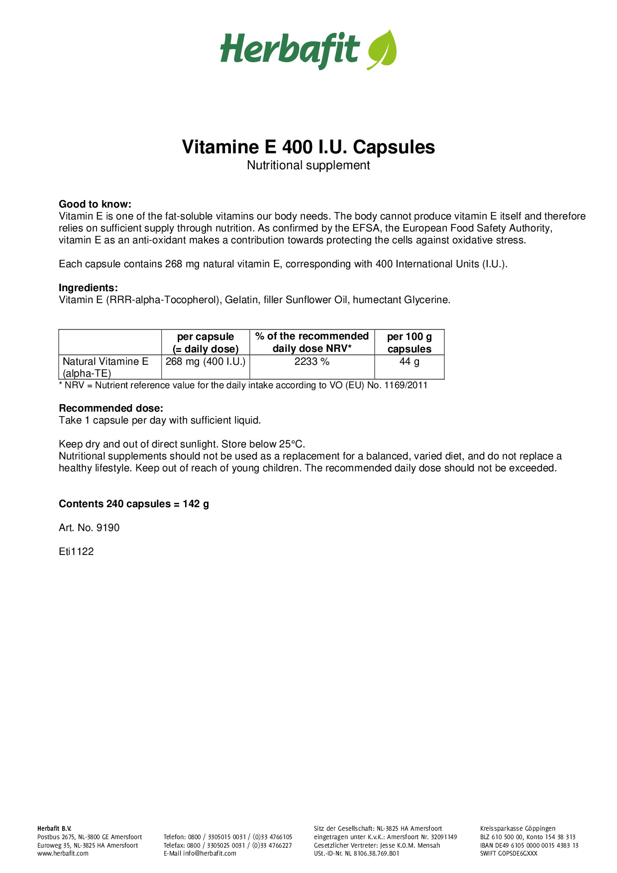 Each capsule contains 268 mg natural vitamin E, corresponding with 400 I.U..